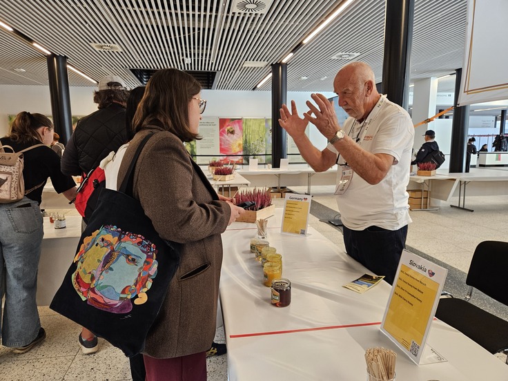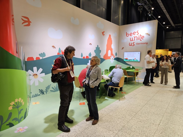 Am Kongress nahmen über 8.000 Besucherinnen und Besucher aus mehr als 124 Ländern teil. Die Ausstellung umfasste 216 Stände – und mittendrin unser Stand unter dem Motto „Germany – Bees unite us“, bewusst ohne die Logos der beiden Verbände.