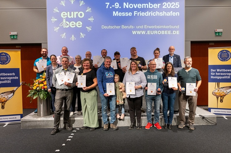 Erstmals wurde in diesem Jahr der eurobee Honey Award abgehalten. In zehn Kategorien konnte Honig aus der Ernte 2025 zur Honigprämierung angemeldet werden. Anders als bei bisherigen Prämierungen gab es nicht beliebig viele Medaillen, sondern in jeder Kategorie jeweils nur eine Gold-, eine Silber- und eine Bronzemedaille. Bewertet wurde ausschließlich nach sensorischen Kriterien – also Geschmack, Geruch, Farbe und Textur. Davor wurden die Honige einer klassischen Laboranalyse und zusätzlich einer DNA-Trachtanalyse zur Qualitätssicherung unterzogen. Die Teilnahme an der Prämierung kostete für DBIB-Mitglieder 250 €, für Nichtmitglieder 350 €.