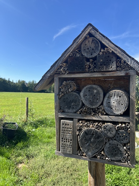 Simon Opitz nutzt für seine Bienenstöcke eine kleine Brachfläche, die auf der einen Seite an den Garten seines Elternhauses und an der anderen an eine große Weidefläche grenzt (siehe Foto). Aber auch bei Bekannten stehen noch weitere Völker von ihm. In unmittelbarer Nähe zu seinen Bienenständen befindet sich auch ein Insektenhotel. Hier sind einige Feldwespen auszumachen.